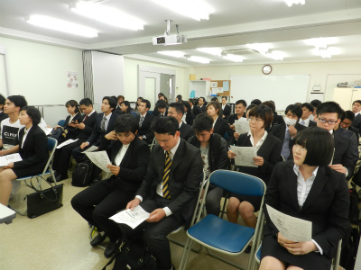 5月20日(金)には「面接対策」授業で、面接試験時の身だしなみや立ち振る舞いについて、講師の指導のもとお互いの服装をチェックしたりしました。5月27日は、「自由討論」として社会人になること企業で働くために必要なことなどをお互い確認し合いました。