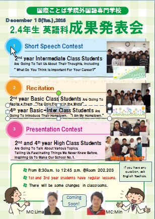 スピーチ部門とプレゼンテーション部門の間には、初級クラスの英語での詩の朗読や11月19日から12月2日まで行われたフィリピン英語研修に参加した、徳美卓也さん、グェン・ティ・ゴアンさん(ベトナム)、ヴ・ティ・ハンさん(ベトナム)の3名よりフィリピン研修の報告会も行われました。
