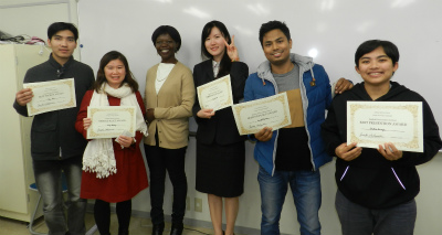 「プレゼンテーション部門」では、「Why should we quit smoking ?」をテーマにプレゼンテーションした、リー・トゥ・アンさん(ベトナム)が3位、「Technology in human life」をテーマにしたダンゴル・スマンさん(ネパール)が2位、「What can I do as an Indonesian student in Japan」をテーマにプレゼンテーションしたデスティラ・ソラヤさん(インドネシア)が優勝しました。1位のデスティラ・ソラヤさんはプレゼン内容、表現力とも満場一致の1位でした。2位から4位は僅差での受賞でした。