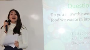 「個人部門」では、「How Can We Reduce Food Waste? (食品廃棄物をどう減らせるか)」というテーマでプレゼンテーションした、LOCHANAさんが優勝しました。準優勝は、「Food waste (食品ロス)」をテーマにプレゼンテーションした高田光莉さん、3位は、「Fortune Comes In By A Merry Gate (笑う門には福来たる)」をテーマにプレゼンテーションした伊藤珠江さんがを受賞しました。
