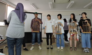 また、ステージでは、司会者もいない、出場者もほとんどいない、という状況の中、出だしの岩本先生が心意気で見せた一人ダンスで会場は一気に盛り上がり、まるで台風を吹き飛ばすかのようでした。熱演が続く中インドネシア人のANNIS FRISKA SAFAさん(インドネシア)のアンクルンの指導ぶりはすばらしく、舞台に引っ張り出されたお客様は初めてアンクルンを手にし戸惑いながらも、あっという間に「キラキラ星」を合奏し、会場から大喝采を受けました。