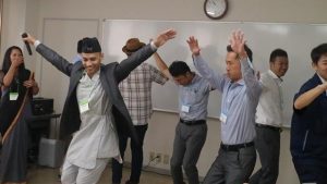 ネパールの歌を歌ってくれたバスネット・マノジさんは、ネパールの曲を日本語の替え歌にし、企業担当者の方々と一緒に歌いながら、ダンスも見せてくれました。サファさんによるインドネシアの楽器アンクルン演奏の指導は圧巻で、企業担当数人の方々にそれぞれの音符を担当してもらい、あっという間に一つの曲を合奏まで仕上げてくれました。学生とは思えないサファさんのコミュニケーション力と指導力に、会場の皆様も感動していました。