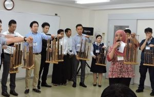 ネパールの歌を歌ってくれたバスネット・マノジさんは、ネパールの曲を日本語の替え歌にし、企業担当者の方々と一緒に歌いながら、ダンスも見せてくれました。サファさんによるインドネシアの楽器アンクルン演奏の指導は圧巻で、企業担当数人の方々にそれぞれの音符を担当してもらい、あっという間に一つの曲を合奏まで仕上げてくれました。学生とは思えないサファさんのコミュニケーション力と指導力に、会場の皆様も感動していました。