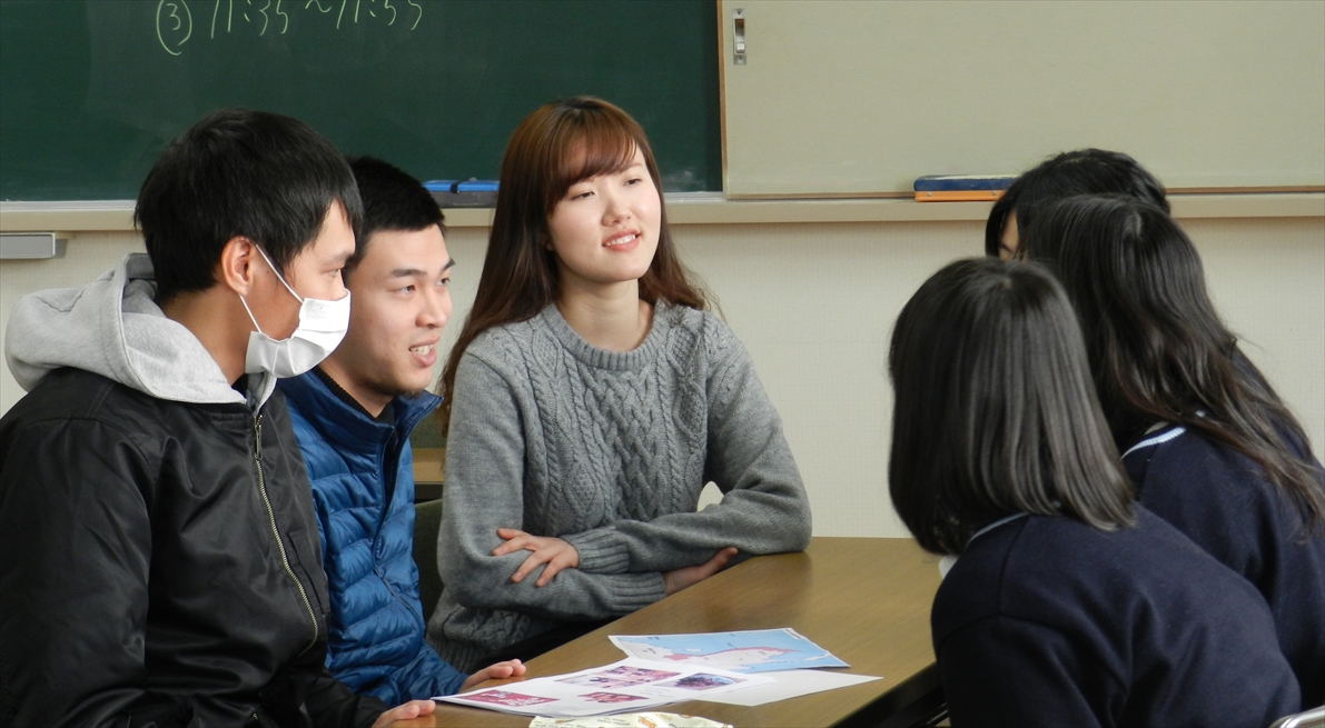 2月7日(火)静岡城北高校国際科の3年生17名の皆さんと当校の中国、ベトナム、インドネシア、スリランカ、ネパール、ミャンマー、インドの7ヵ国の学生15名が英語での交流授業を行いました。英語で母国についてのヒントを出し、出身国を当てるゲームからはじまった交流授業。6つのグループに分かれ、20分ごとに3回のフリーディスカッションが行われました。母国の食べ物や特長を留学生が紹介すると、高校生は漢字の文字やけん玉やアニメなどの日本文化を紹介していました。