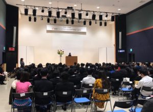 4月6日土曜日、コミニティホール七間町MIRAIEリアンにおいて平成31年度入学式が約130名の 新入生を迎えて行われました。新入生が一人ひとり名前を呼ばれて紹介された後、ファン・ティ・ホンさん(ベトナム)が代表して、ここでの勉強や経験は将来必ず役に立つので失敗を恐れず何事にも挑戦していきたいと決意を述べました。続いて、在校生を代表してデシ ハルディアンティさん(インドネシア)が 日本語・英語・韓国語の3言語を使って歓迎の言葉を述べました。最後に袴田靖子校長より、外国人との共生が現実となってきた今日、留学生も日本人もお互いのことを知識としてわかるだけではなく、本人が感じるレベルまで感じることができるかどうかが重要となるため、「俯瞰力とエンパシー」を身につけて活躍していってほしいと期待を込めたお祝いの言葉が贈られました。(山内)